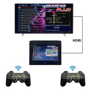 This Console Also comes with a 9000mAh Battery which can provide almost 5 Hours continuous Playing. You can also play by using its power adapter in Plug in Charging mode. You can Also connect a larger Display By HDMI port. It is also compatible with PC monitor connectivity By VGA Port. There is a setting button for customization of this console. It has built in speaker and a volume controller to adjust its volume. There are 2 USB Ports to connect Warless 2.4g joysticks. There is TF Card slots to access its storage. You can use this device for playing game while you are traveling or you are in your home.