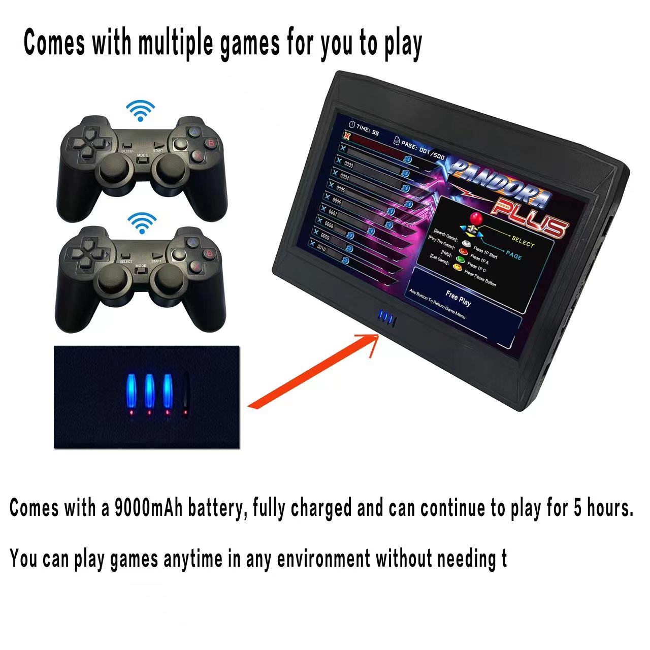 2 Player Pandora Game box With 10 Inch Display Built in 26800 Games. Playing game is more fun now. This Device came with a HD 10 Inch Display. Display Resolution 1280x720p. It could be played by 2 wireless controller. All popular Games of Arcade Video Games are on one Device, Like Street Fighter, King of Fighters, Metal Slug, Samurai Shadow, Cadillac & Dinosaurs, Violent Strom, warriors of fate, Punisher, Captain Commando, Taken etc.